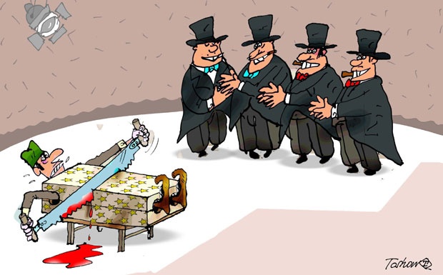 САД, НАТО и већина земаља ЕУ уживају и аплаудирају у самоуништењу Србије (Карикатура: Тошо Борковић)