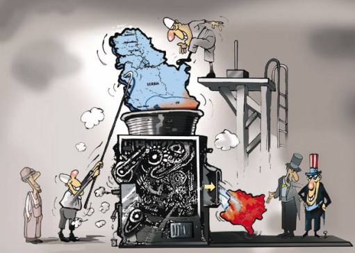 Западна машинерија стално кроји, мења “непоменљиве” границе на Балкану – ствара нове државе, увек на штету Србије (Карикатура Горана Дивца)