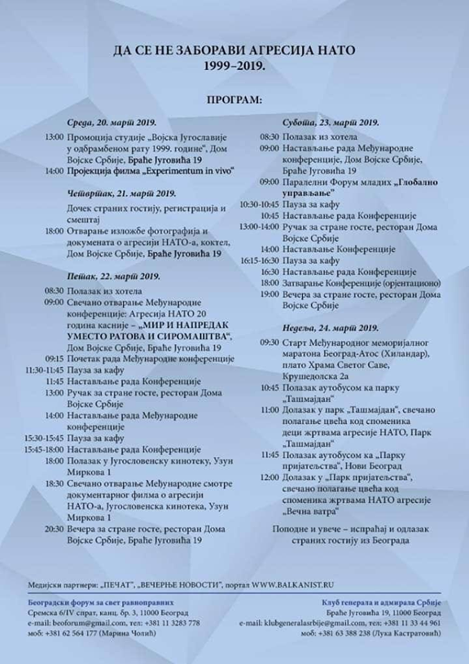 Под називом „Мир и напредак уместо ратова и сиромаштва“ у Београду ће у петак и суботу бити одржана међународна конференција посвећена две деценије од НАТО агресије. Организатори су Београдски форум за свет равноправних, Клуб генерала и адмирала Србије, СУБНОР Србије и Друштво српских домаћина.