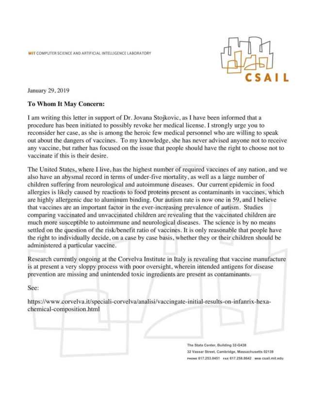 Пишем ово писмо у знак подршке др Јовани Стојковић, јер сам обавештена да је покренут поступак да јој се евентуално одузме лиценца за рад у здравству. Чврсто вас позивам да хитно размотрите њен случај, јер она је један од свега неколико херојских лекара који су вољни да говоре о опасностима од вакцина. Колико ја знам, она никада никога није саветовала да не прими вакцину, већ се фокусирала на то да људи треба да имају право да одлуче да не вакцинишу ако је то њихова жеља.