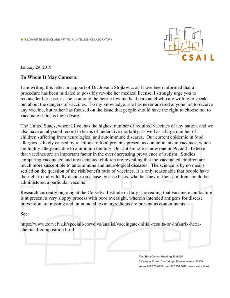 Пишем ово писмо у знак подршке др Јовани Стојковић, јер сам обавештена да је покренут поступак да јој се евентуално одузме лиценца за рад у здравству. Чврсто вас позивам да хитно размотрите њен случај, јер она је један од свега неколико херојских лекара који су вољни да говоре о опасностима од вакцина. Колико ја знам, она никада никога није саветовала да не прими вакцину, већ се фокусирала на то да људи треба да имају право да одлуче да не вакцинишу ако је то њихова жеља.
