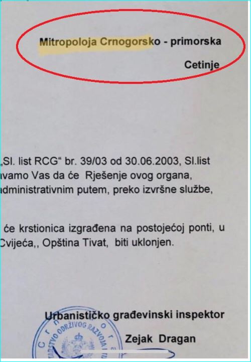 Крила испекцији дао је министар одрживог развоја и туризма Павле Радуловић који је ратнохушкачки поручио да ће крстионица сигурно бити срушена.
