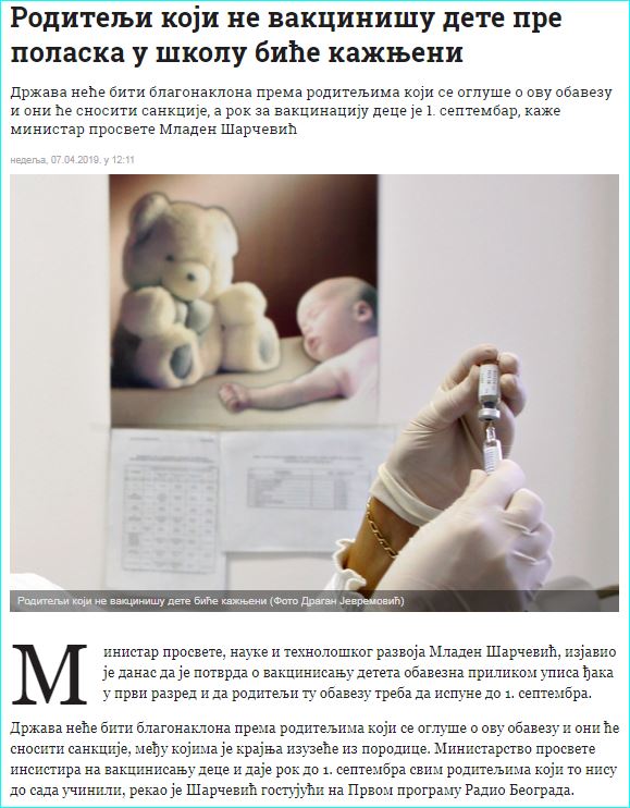 недеља, 07.04.2019. у 12:11, ПОЛИТИКА http://www.politika.rs/scc/clanak/426793/Obavezna-vakcinacija-prvaka-pre-polaska-u-skolu