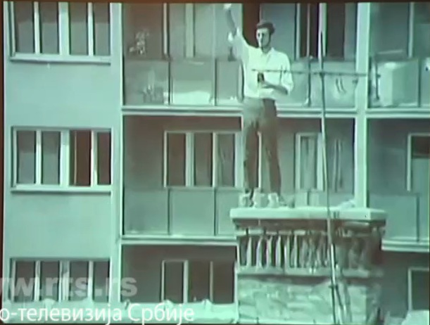 Онако високог и кракатог видео га је Љубивоје Ршумовић и сликао, снимио, фотографисао и направио видео-прилог за ТВ Београд пре 60 година! (Прилоге о овом уметничком ангажману направили су и италијанска РАИ, Студио Уно и Француски ТВ, Канал 2.) Тај кратки прилог био је права сензација за Београд, сви су се питали ко је тај млади уметник, шта он то ради, шта хоће?