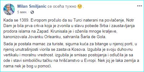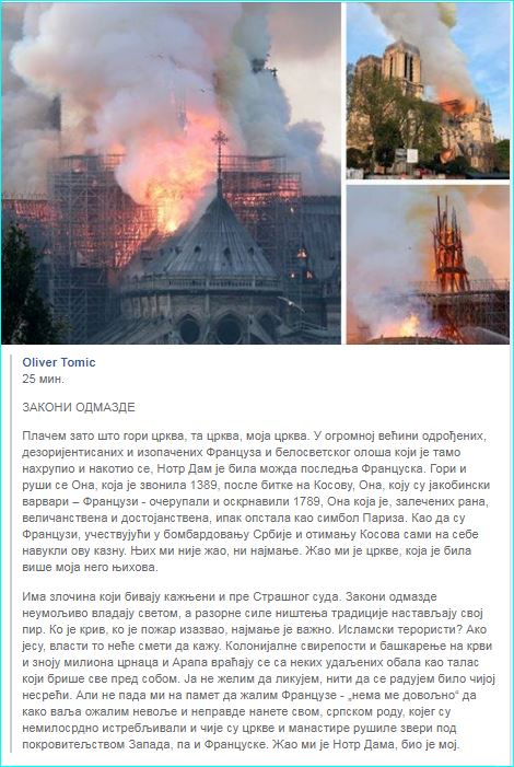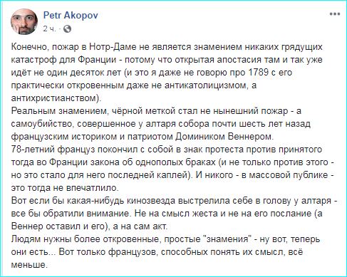 „Стварни симбол, црни знак француске апостасије и будућих невоља није данашњи пожар, већ самоубиство које се пре шест година догодило у олтару Нотр Дама.