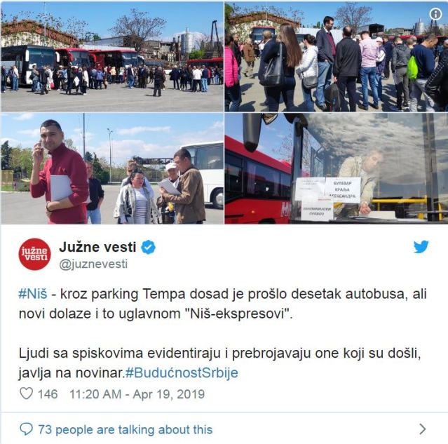 Како јављају репортери „Блица“, аутобуси са присталицама СНС кренули су ка Београду из бројних градова Србије, укључујући и Брус, одакле, између осталих, долази и доскорашњи председник општине Милутин Јеличић Јутка, оптужен за сексуално узнемиравање бивше секретарице Марије Лукић.