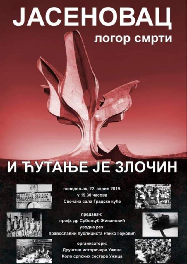 „Друштво историчара Ужица“ и „Коло српских сестара“ из истог града, у понедељак 22. априла у 19:30, у Свечаној сали Градске куће у Ужицу, организују трибину на тему покоља у клеронацистичкој НДХ са насловом – „Јасеновац логор смрти – и ћутање је смрт“. Модератор трибине је Снежана Недељковић, председник Друштва историчара Ужица. Своју песму „Јасеновац“ прочитаће наша позната песникиња и новинарка Биљана Диковић. Уводну беседу на тему покоља Срба у Херцеговини у клеронацистичкој НДХ, као и о духовној димензији српског страдања и заинтересованости руске јавности за ову тему, одржаће православни публициста Ранко Гојковић.