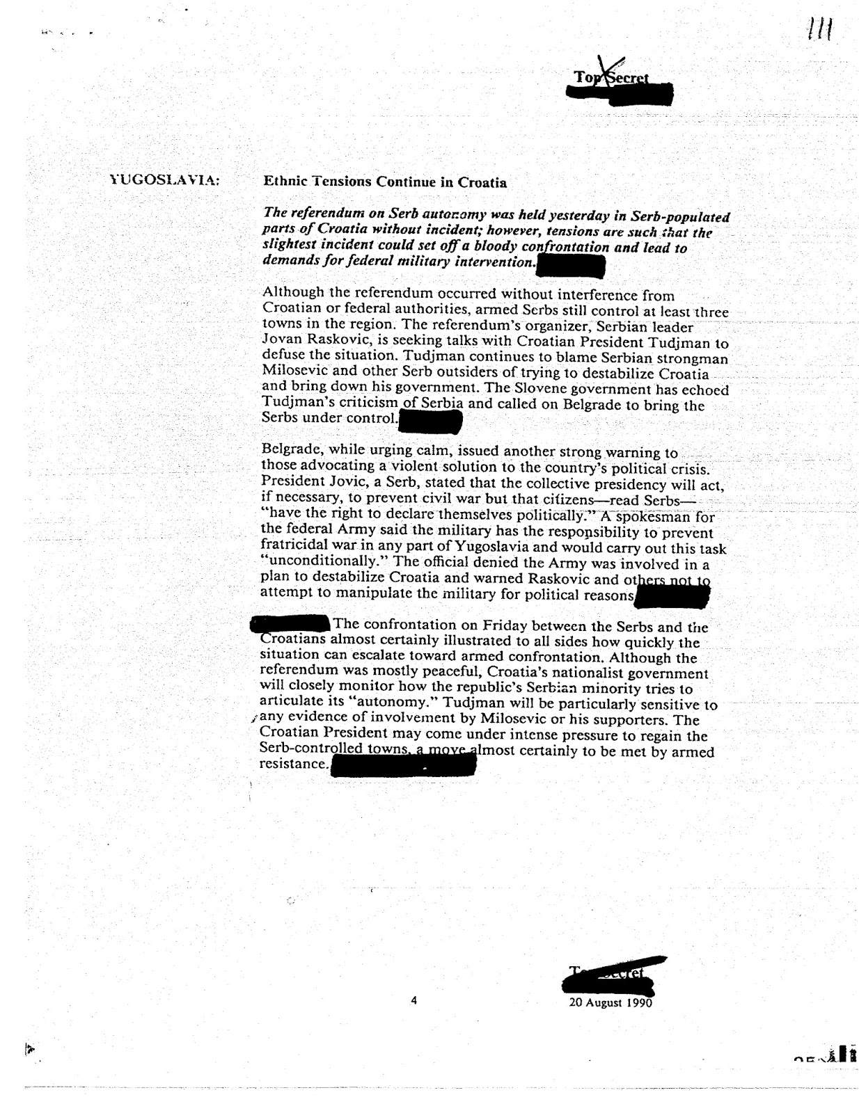 „Тај извештај, попут некаквог морбидног сигнала типа: „уништићемо вас“, најављивао је да ће у току следећих 18 месеци Југославија бити искасапљена ескалацијом насиља, како је писало у документима – „са великом могућношћу “ да се претвори у грађански рат. Тај документ, написан од стране ЦИА, прецизира да је „експеримент Југославија пропао и држава ће бити уништена“, додајући да ће „највероватније бити пропраћено експлозијама етничког насиља и побунама који ће сасвим извесно довести до грађанског рата“. У том извештају ЦИА-е је прецизно дефинисано да председник Милошевић мора бити оптужен као „главни кривац“ у будућим, југословенским конфликтима.
