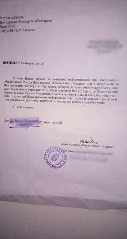 - Поднели Захтев за потпуним информисањем својим педијатрима9 и добијали одговоре да „ДЗ Смедерево није у могућности да адекватно одговори, обзиром да такве информације могу дати само институције меродавне за то“, као и да захтев упуте „некој фармацеутској кући“. ДЗ Нови Сад није дао одговоре, већ је упутио на Институт за јавно здравље Батут. ДЗ Ниш такође није дао одговор ни на једно питање, али је искрено признао да је само „извршилац обавезне вакцинације“, те да се за састав вакцина и остала питања, обратимо неком другом, што би онда значило да ДЗ Ниш не зна састав вакцина?