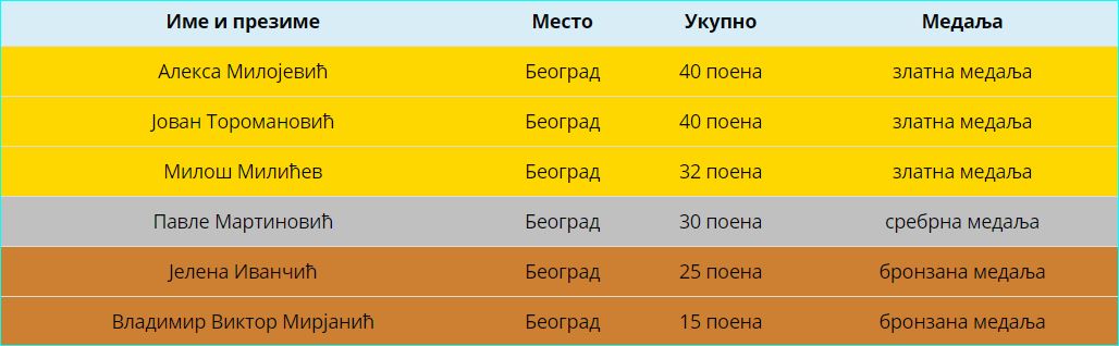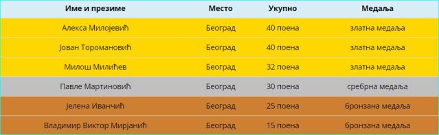 Млади математичари Србије постигли су још један заиста вредан успех. У конкуренцији 11 званичних и 6 гостујућих земаља математичка екипа Србије је са 182 поена освојила ПРВО МЕСТО. Појединачни резултати су три златне, једна сребрна и две бронзане медаље.