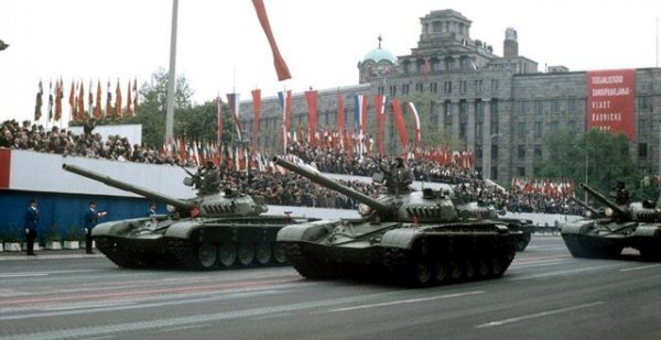 Прва, у правом смислу речи, парада у част Дана победе у нас одржана је 9.маја 1965.године након донете одлуке да се престане са првомајским годишњим парадама, и да се отпочне са слављењем победе сваке пете године, зато што би одржавање свечаности сваког 1. или 9. маја изискивало превелике новчане издатке. То је била и прва чисто војна параде. Значајно је напоменути да су до 1965. по правилу одржаване велике параде поводом Првог маја са учешћем војске и њене технике, као и других организација. Након ове прве, одржане су још три: 1970, 1975. и 1985.године у којима су учествовале и снаге милиције. Парада 1980.године није одржана услед жалости за Титом који је преминуио 4. маја исте године. Учестовали су ешелони сва три вида армије са техником, а параде су коришћене за приказ нове технике, како оне купљене из иностранства, тако и оне освојене „домаћом памећу”. Колона је из Булевара револуције пролазила поред платоа испред Савезне скупштине и даље поред Трга Маркса и Енглеса идући према Француској улици. Ношене су државне и партијске заставе јединица из Народноослободилачке борбе уз обавезно одавање почасти ветеранима и врховном команданту. Обавезен је био и прелет авиона ратног ваздухопловства, као и дефиле противваздушне одбране, а парадирала су чак и средства Ратне морнарице која су вучена на приколицама (џепне подморнице, патролни чамци).