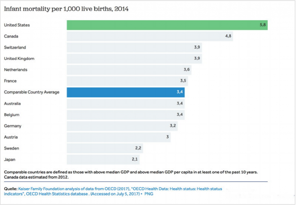 Извештај Центра за превенцију и лечење болести (CDC) о морталитету новорођенчади је врло важан показатељ о укупном стању здравља друштва. Агенција је узела у обзир јапански степен који је 2 мртва одојчета на 1.000 живорођене деце, као други најнижи степен у свету, јер на првом месту је Монако са најнижим степеном смртности новорођенчади. У поређењу са Америком, где скоро три пута више беба умре (5,8 на 1.000 живорођених беба), успркос веома великих износа по глави пацијента за лечење деце (види Табела 2). По смртности новорођенчади САД се налази на 55 месту у односу на остале земље света, и испред САД налазе се Латвиа, Словачка и Куба…