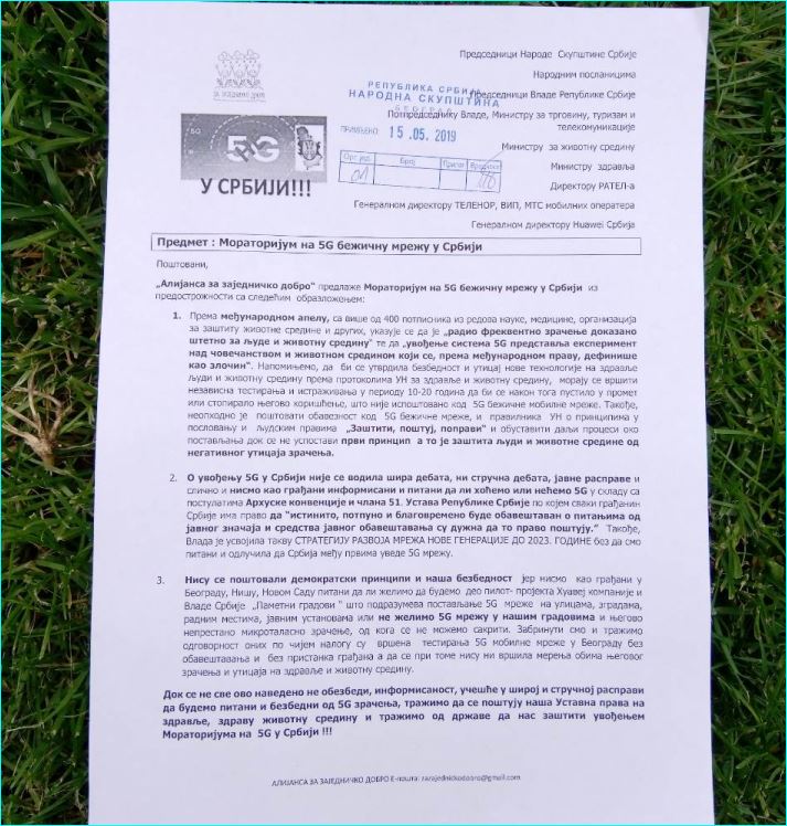 - Нису се поштовали демократски принципи и наша безбедност јер нисмо као грађани у Београду, Нишу, Новом Саду, питани да ли желимо да будемо део пилот-пројекта Хуавеј компаније и Владе Србије „Паметни градови“, што подразумева постављање 5G мреже на улицама, зградама, радним местима, јавним установама или не желимо 5G мрежу у нашим градовима и његово непрестано микроталасно зрачење, од кога се не можемо сакрити. Забринути смо и тражимо одговорност оних по чијем налогу су вршена тестирања 5G мобилне мреже у Београду, без обавештавања и без пристанка грађана а да се при томе нису ни вршила мерења обима његовог зрачења и утицаја на здравље и животну средину.