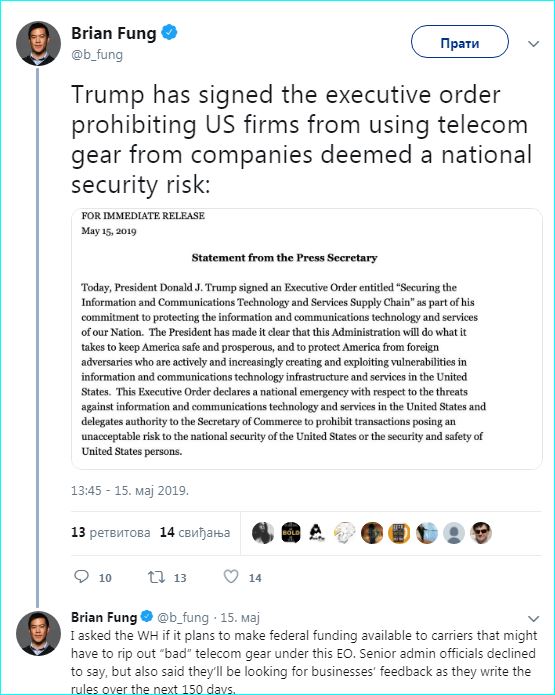 Амерички председник Доналд Трамп прогласио је ванредно стање због технологија које су осмислили или произвели „страни непријатељи“, што је чин очигледно усмерен на кинески ЗТЕ и Хуавеј у покушају да их удаљи са 5G тржишта.