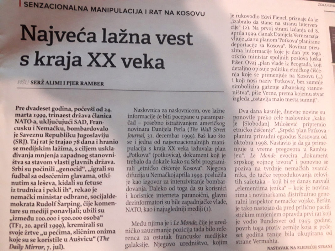 Прије 20 година, почевши од 24. марта 1999. године, 13 држава чланица НАТО-а, бомбардовало је СРЈ. Тај рат је трајао 78 дана и хранио се медијским лажима, у којима је, на жалост, учествовао и наш лист. Главни дезинформатори су биле западњачке владе, НАТО, као и најугледнији медији.