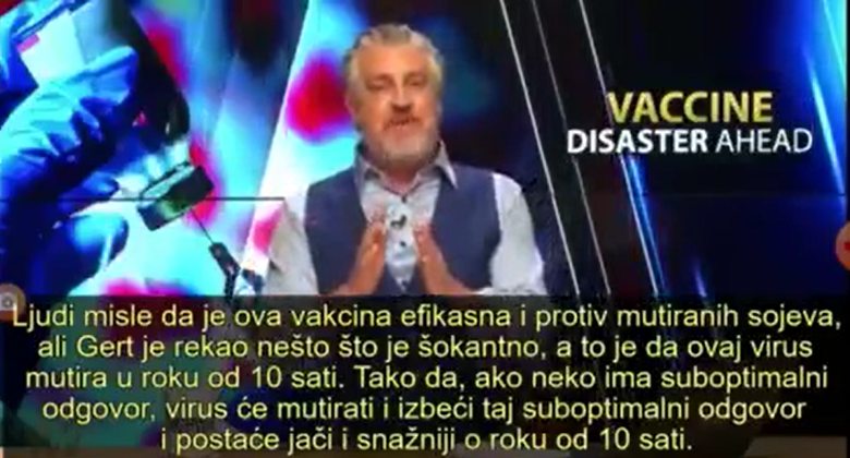 Људи мисле да је ова вакцина ефикасна и против мутираних сојева, али Герт је рекао нешто што је шокантно, а то је да овај вирус мутира у року од десет сати. Тако да, ако неко има субоптимални одговор, вирус ће мутирати и избећи тај субоптимални одговор и постаће јачи и снажнији у року од 10 сати. И зато он каже да не можемо да се утркујемо са тим вирусом. Зар ћемо правити вакцине увек када он мутира? Или, како је добро речено, ако узимамо и трећу дозу, да ли то значи да немамо поверења у две дозе? Овај човек каже да оне неће деловати.