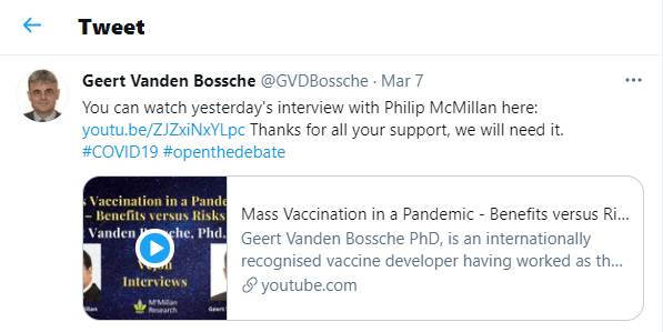 *видео интервју „Масовна вакцинација у пандемији – Користи против Ризика“ („Mass Vaccination in a Pandemic – Benefits versus Risks“) који је имао Dr Philip McMilan са првим у свету научником у области вакцинације Geert Vanden Bossche PhD, DVM, са коментарима Dr. Del Bigtree