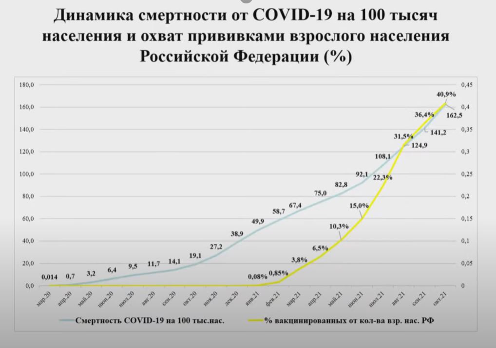 % вакцинисаног одраслог становништва Руске Федерације (%) – жута линија