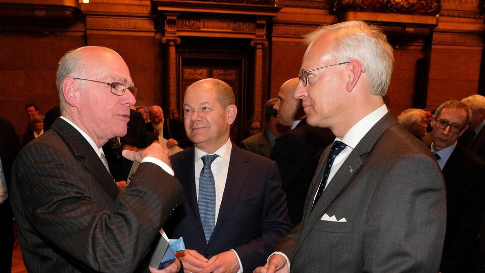 На фотографији с лева на десно: говорник Норберт Ламерт, Олаф Шолц и шеф масона Хамбурга Томас Штуве