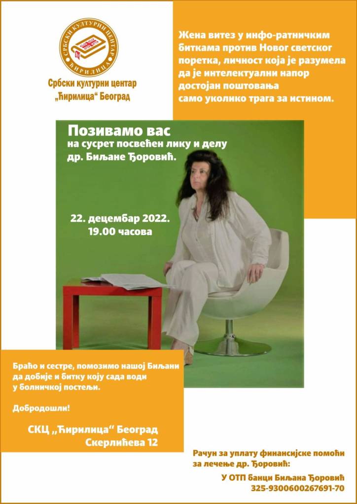 Др. БИЉАНА ЂОРОВИЋ, витешкиња у инфо ратничкој борби против новог светског поретка, личност која је разумела да је интелектуални напор достојан поштовања само уколико трага за истином, хероина која је својим знањем и чулом за историјски развој и геноцидалне циљеве и методологију НСП, пробудила многе од нас. Ово је време мисли и дела др Биљане Ђоровић, и ништа не може бити истинитије.