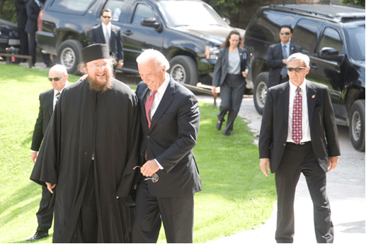 Актуелни игуман Дечана, Сава Јањић, противно благослову надлежног епископа, дочекује Бајдена у Високим Дечанима. Нећете наћи ни једну другу фотографију на којој се Јањић тако срдачно смеје.