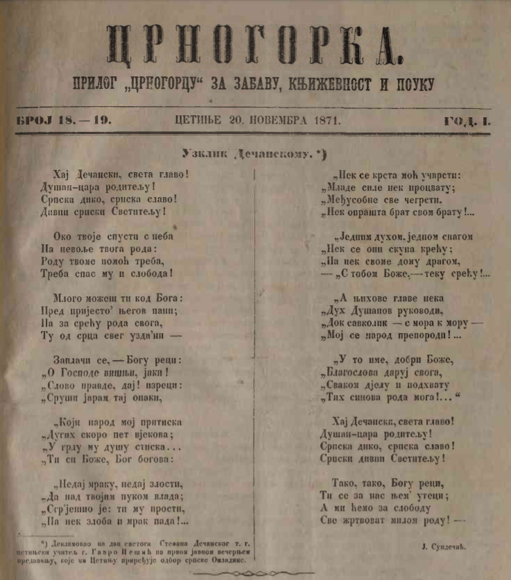 Усклик Дечанскому су стихови објављени у листу ,,Црногорка“ 20. новембра 1871, а рецитовани на Дан Светог Стефана Дечанског од стране цетињског учитеља Гавра Пешића на једном вечерњем предавању које је на Цетињу прије 150 година приредио Одбор српске омладине. Пјесму је написао Јован Сундечић, свештеник Српске православне цркве, дипломата и патриотски пјесник.